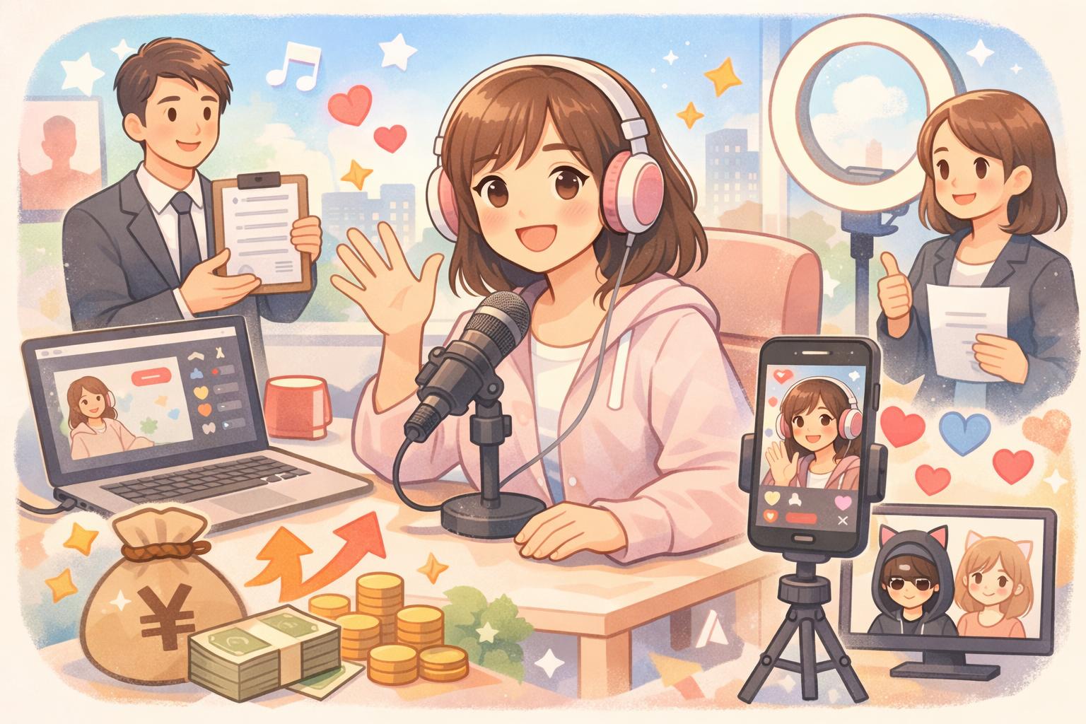 大手事務所の中には、Vライバー向けにアバター制作のサポートを行っていたり、ラジオ配信に特化したノウハウを提供していたりするところもあります。顔出しに抵抗がある方は、こうしたサポートが充実している事務所を選ぶのがおすすめです。